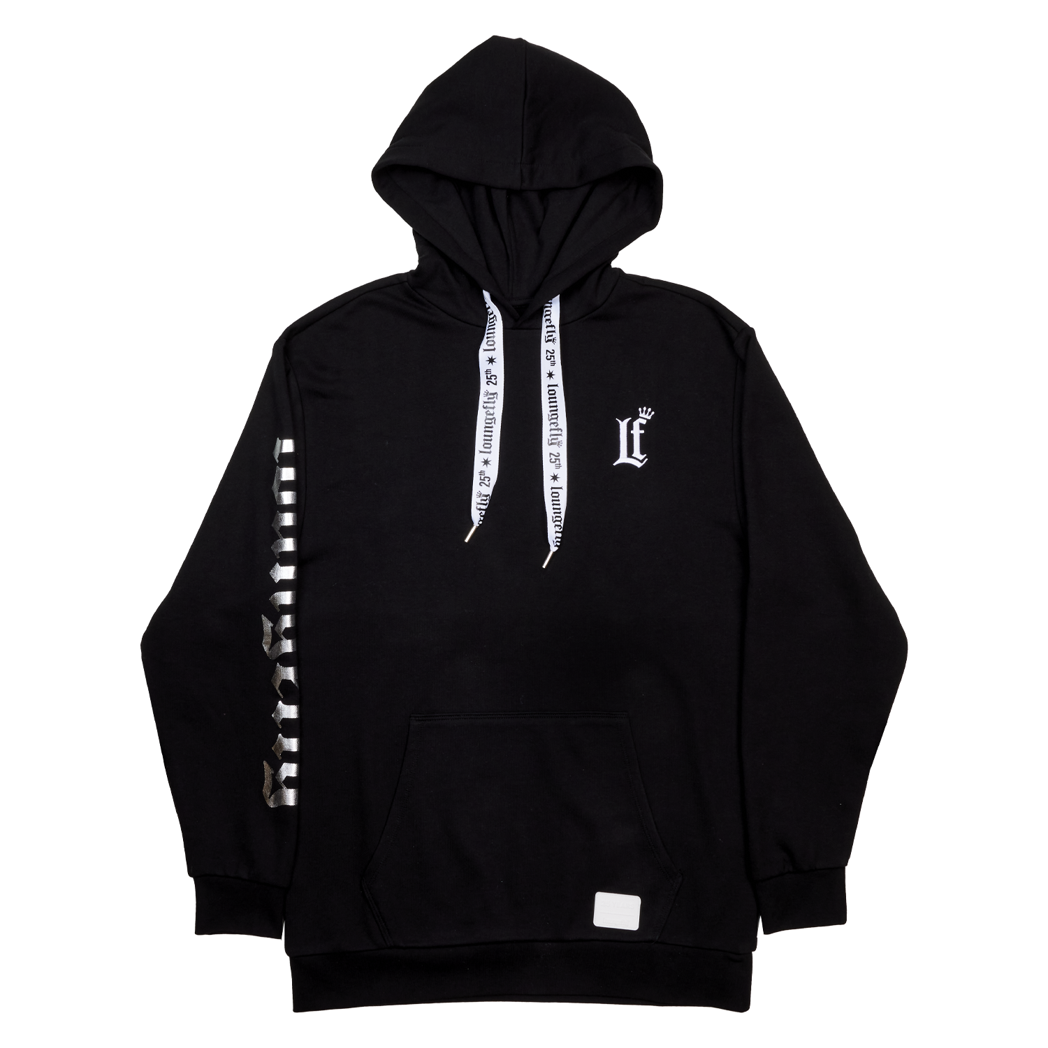 Say cheers to 25 years! Our Loungefly 25th Anniversary Unisex Hoodie is something to celebrate! On the front of this fashionable and comfy black hoodie, the abbreviated Loungefly crown emblem appears at the top in embroidered detail. Over the sleeve of one arm, you’ll find the full Loungefly crown logo in shiny silver foil print. On the back, a characteristic Loungefly mini backpack appears in a printed white outline, along with the words “Loungefly: 25 years” in silver foil print. When the weather turns chilly, slip your hands into the roomy front pocket to warm them up. Show off your love for all things Loungefly and take the celebration with you wherever you go.
