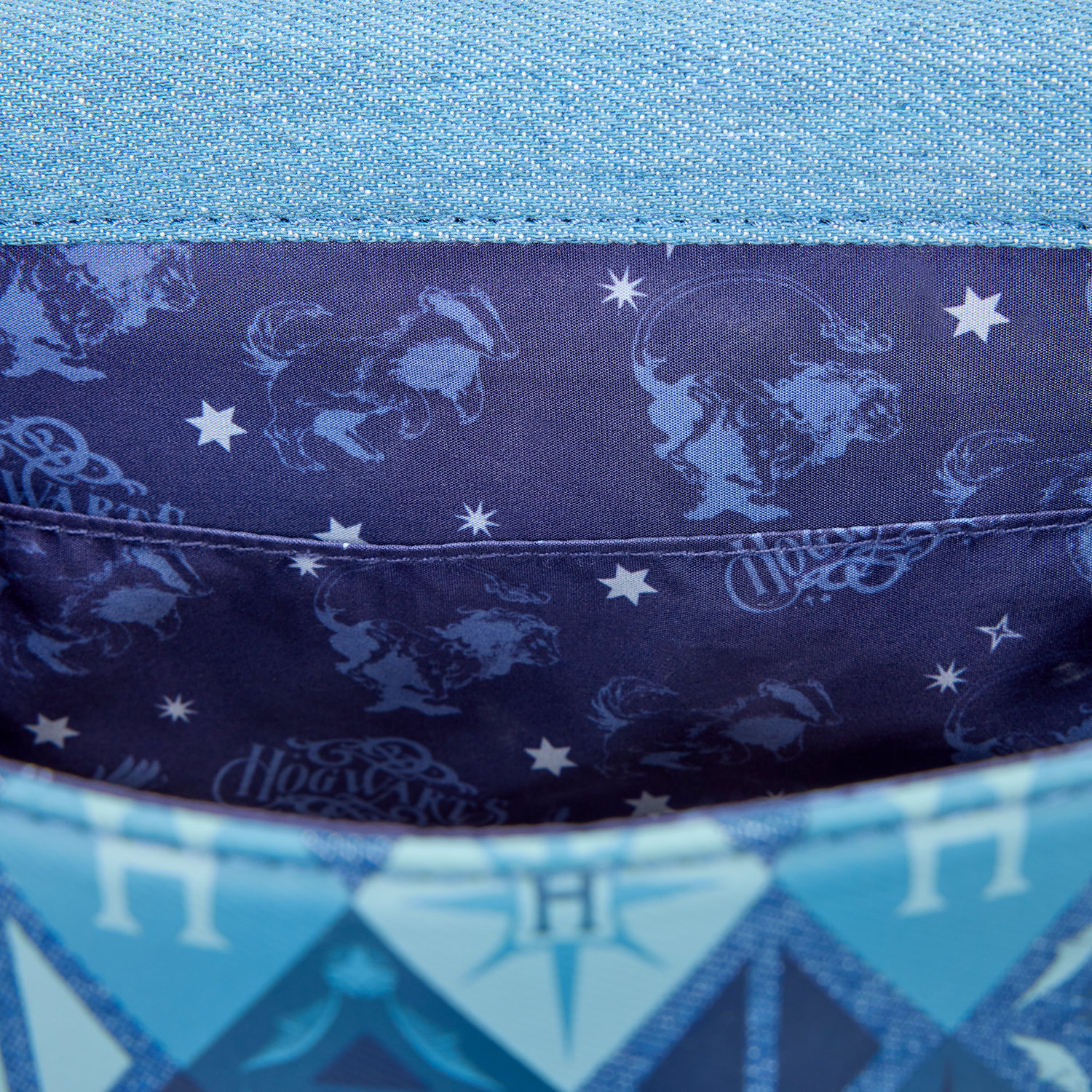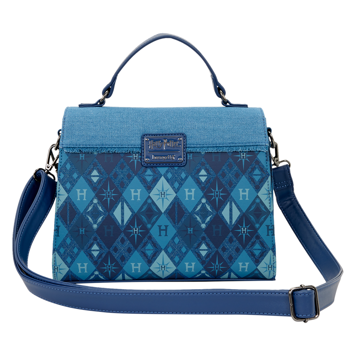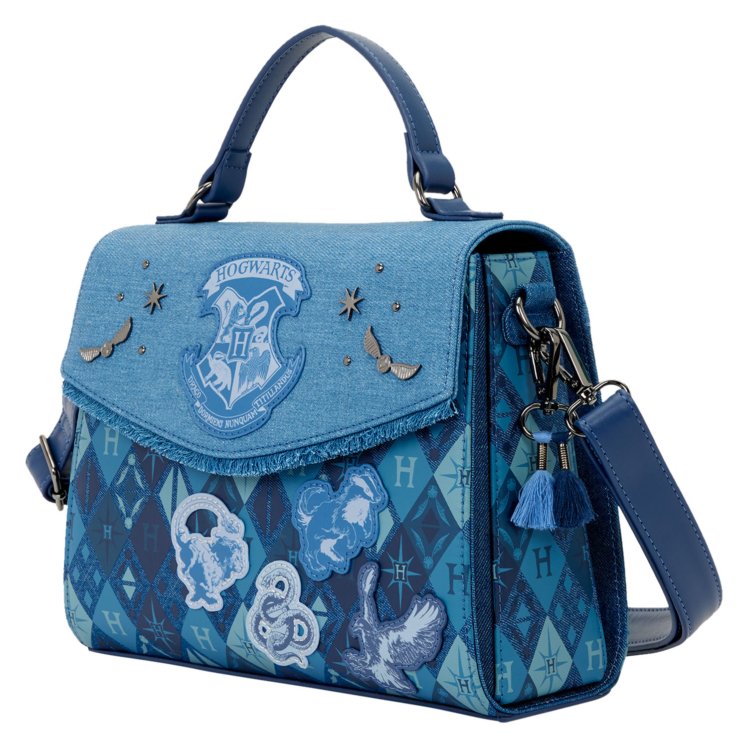 This crossbody bag features faux denim, metal charms, tassels, and fringe! You’ll find the Hogwarts™ crest on the top flap of the bag. The body of the bag features an all-blue argyle-type pattern with images of each Hogwarts™ House animal!