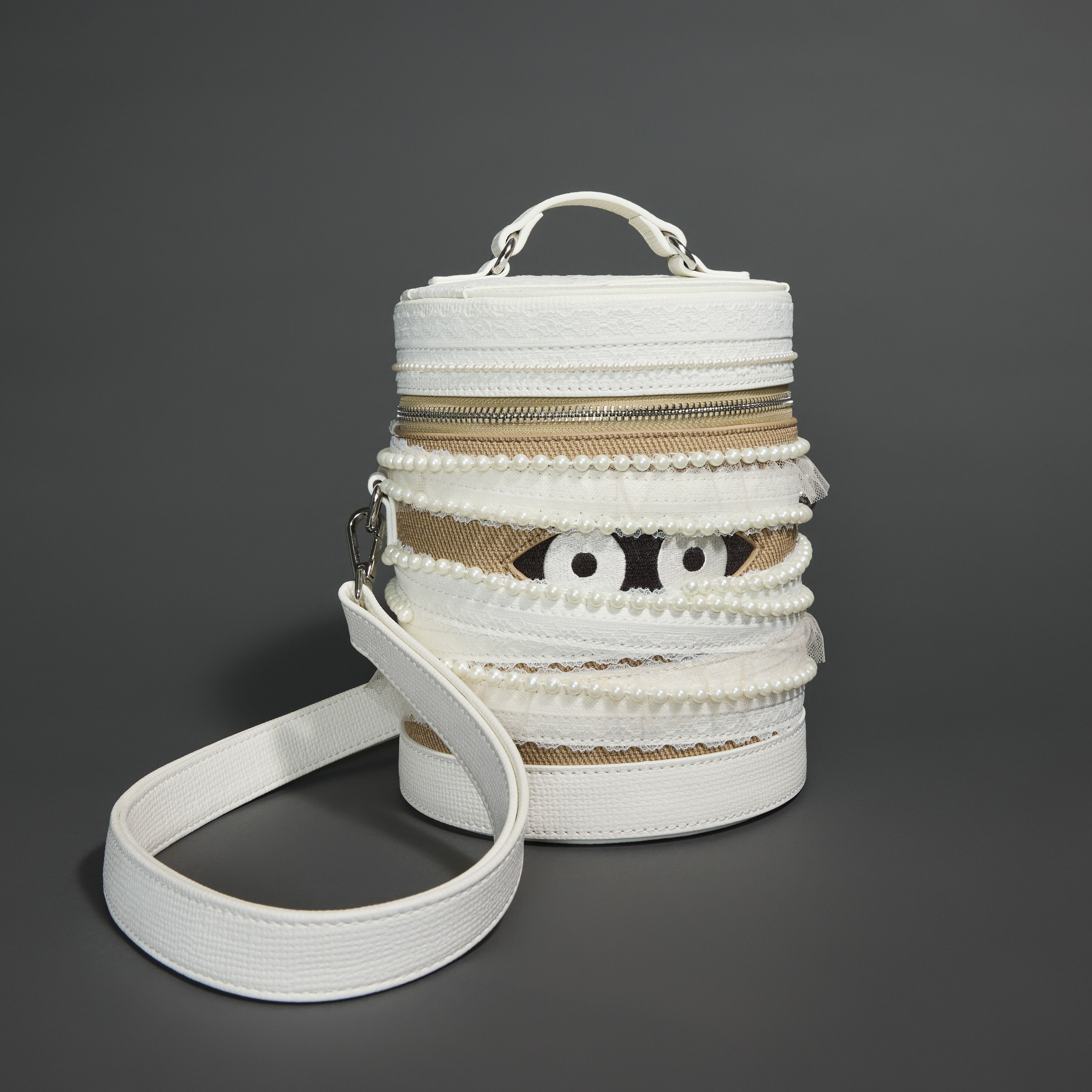 This cylindrical bag features a mummy wrapped in tulle, faux leather, and crochet material. You’ll find embroidered eyes peeking through the wrappings. Faux pearls and glitter give an extra pop of style.