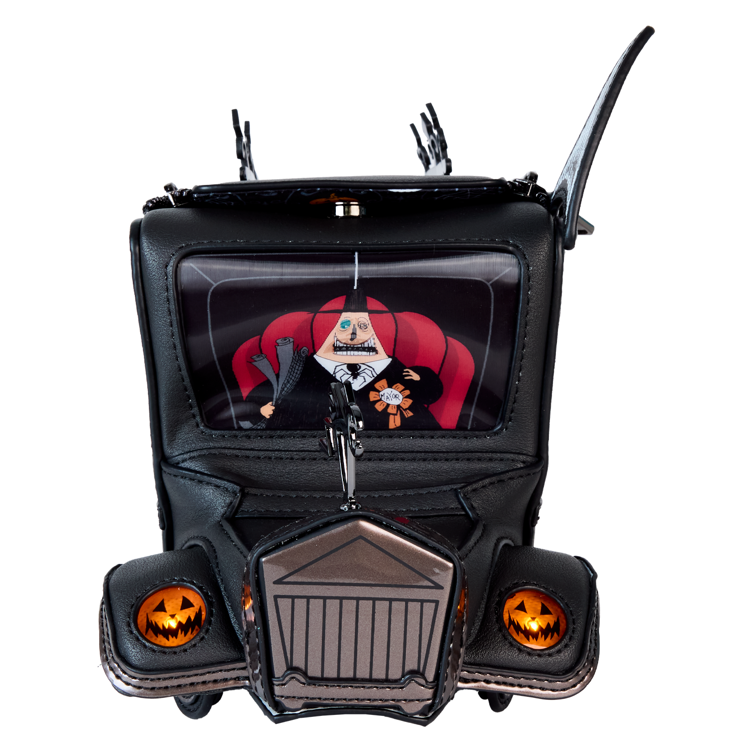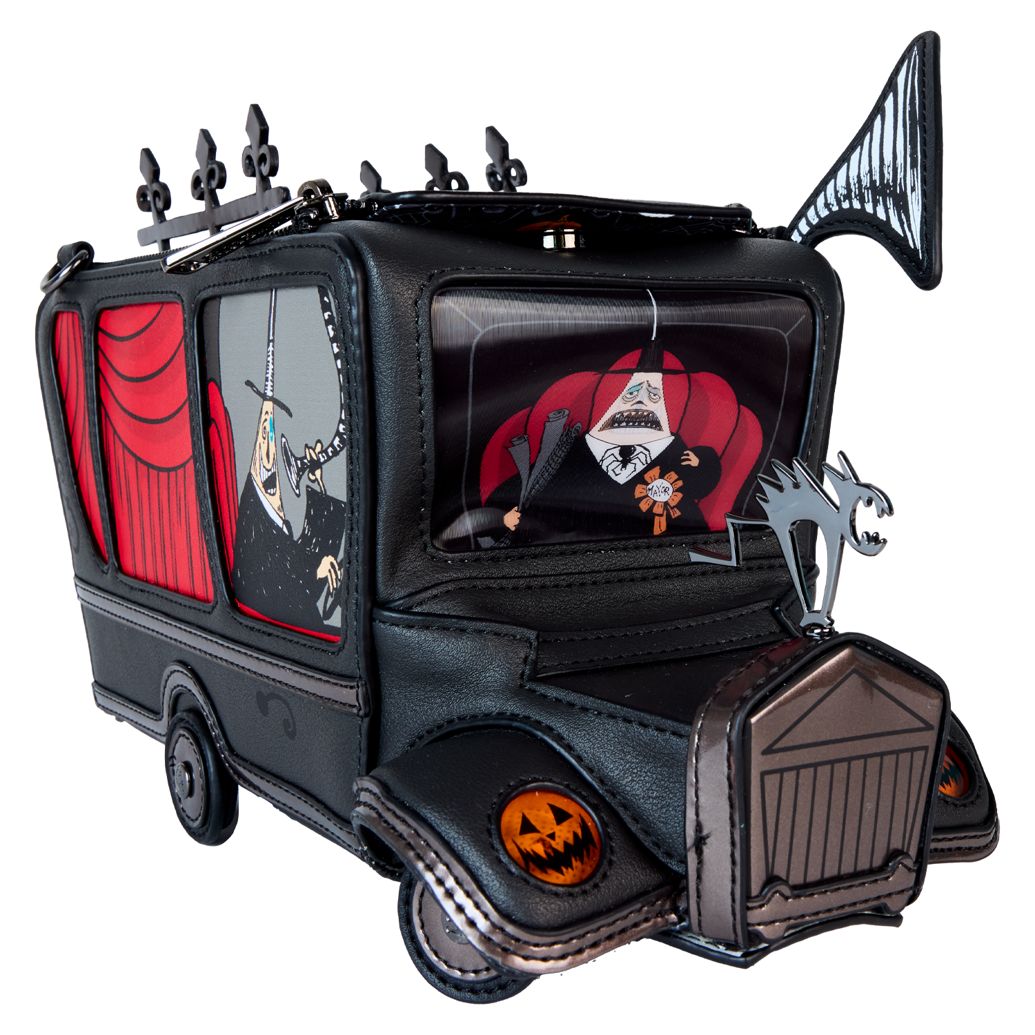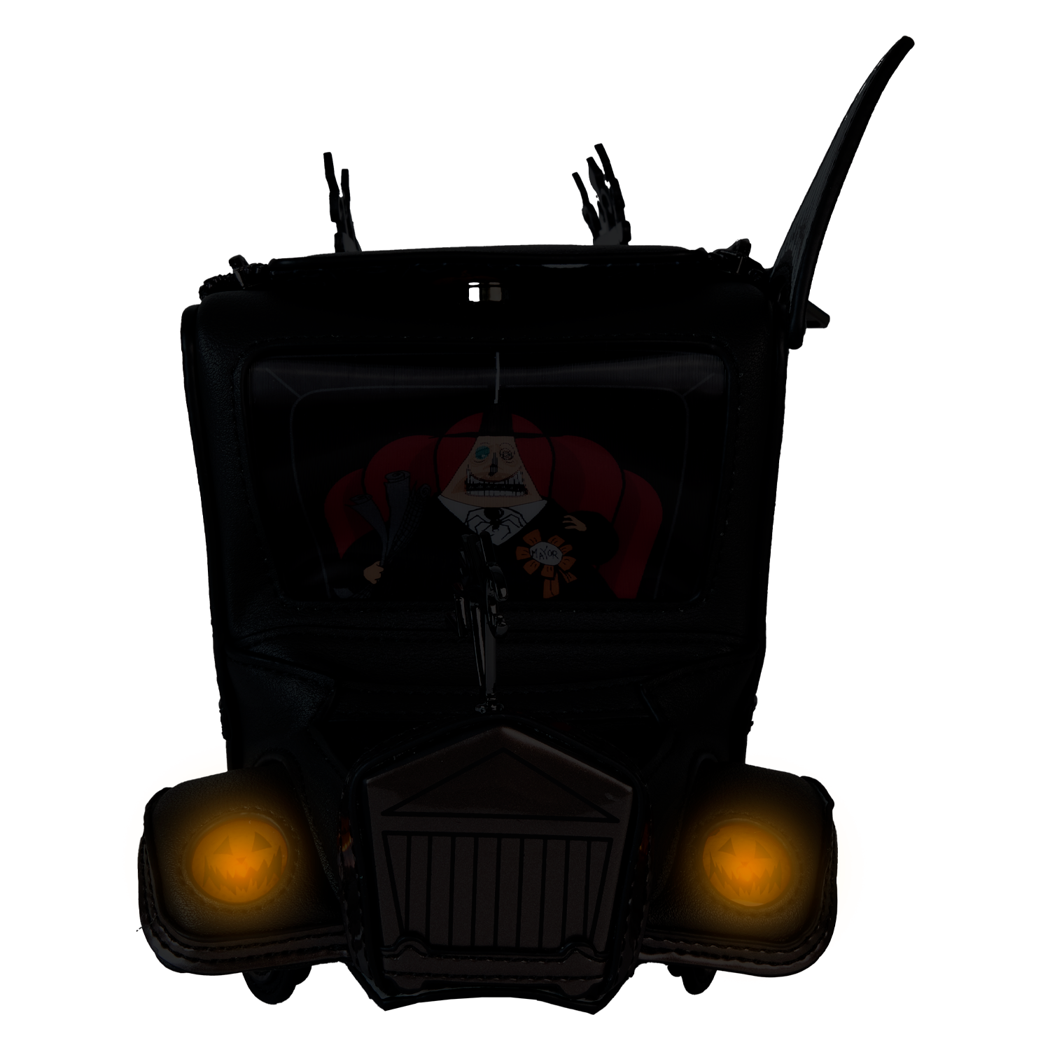 On an official visit to Halloween Town? Take a spin with our Disney Tim Burton’s Mayoral Car Crossbody Bag. This accessory is fully figural, taking on the shape of the Mayor of Halloween Town’s car. All kinds of frighteningly fun details emerge, such as applique wheels, a molded metal figure of a frightened cat on the hood of the car, an applique megaphone, and other molded metal decorative details on top. One side view reveals a print of the Mayor making an announcement into the megaphone. From the front “window,” behind clear PVC material, there’s another view of the Mayor. Lenticular details reveal his face in full color, but with the flick of a wrist, he’s gone pale. The headlights, which are jack-o’-lanterns, light up in the dark. Unzip the top to fill this accessory with your day’s necessities and secure them for the ride. Look hauntingly fashionable wherever you go with this terrifically terrifying accessory.