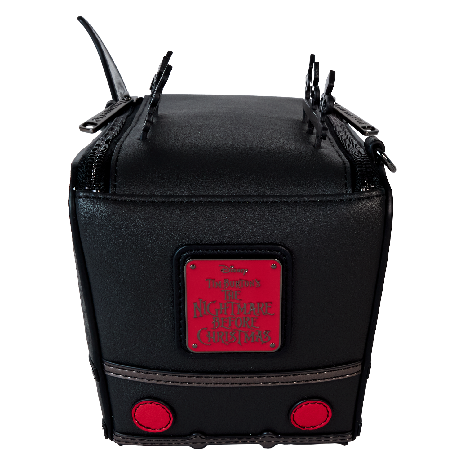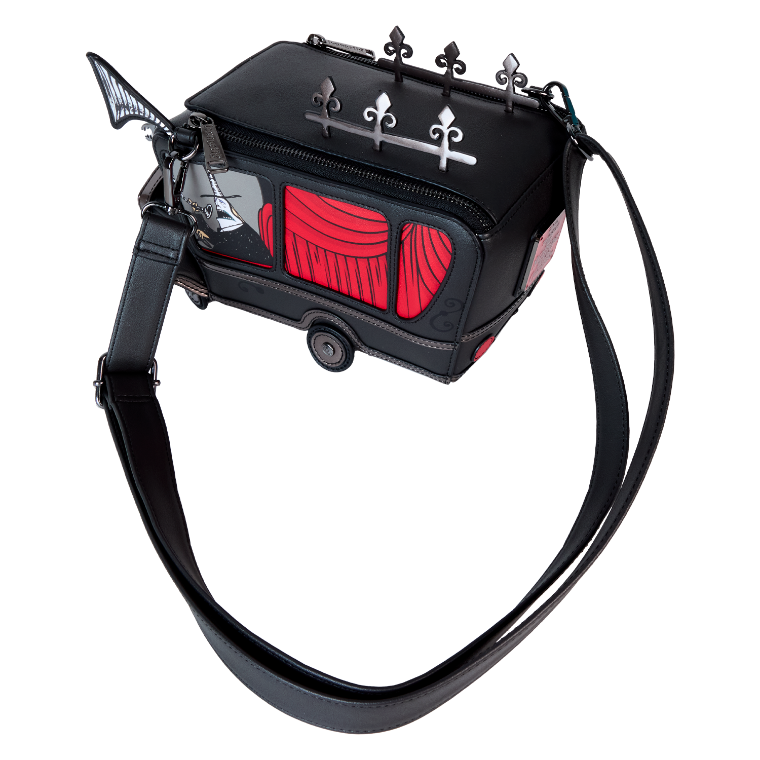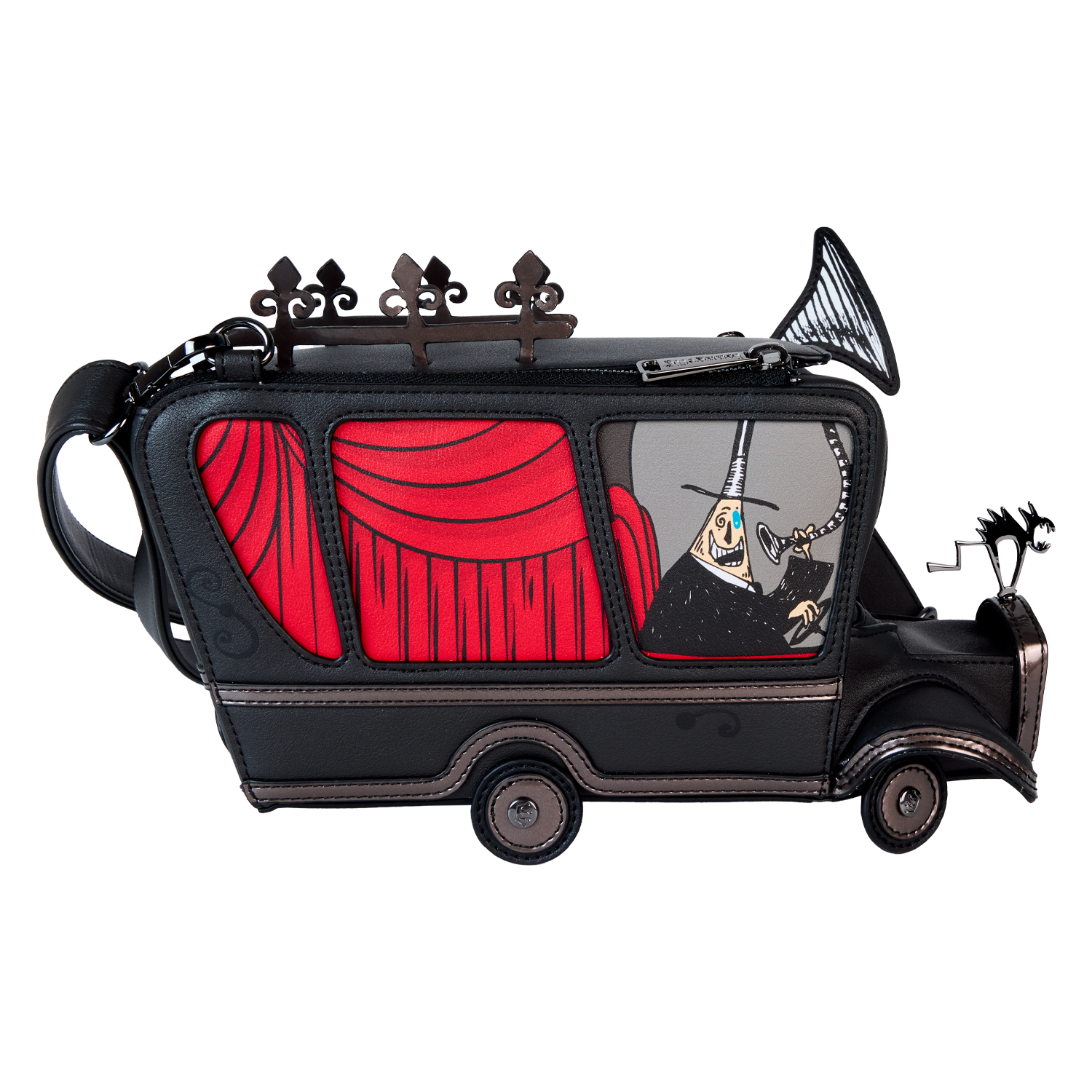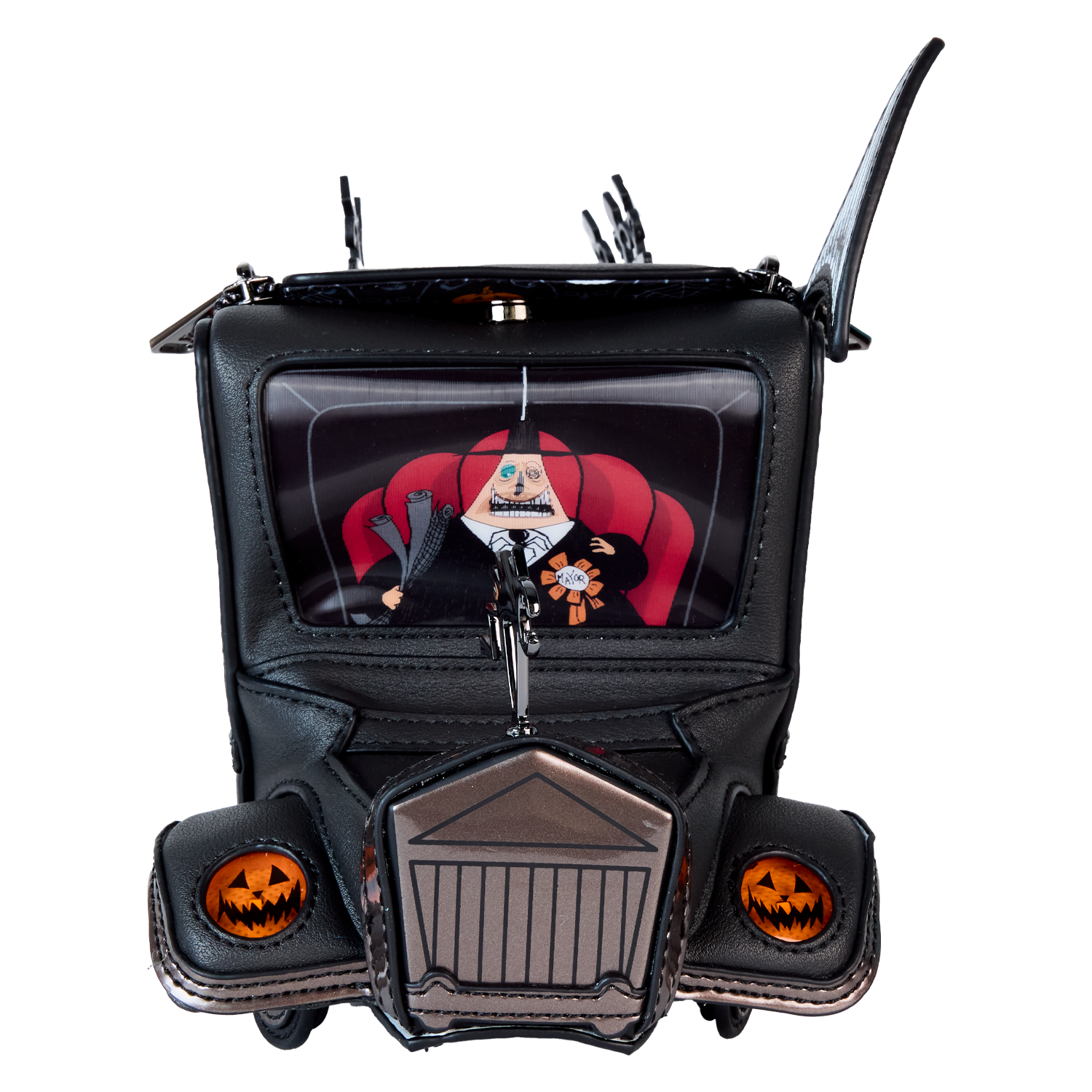 On an official visit to Halloween Town? Take a spin with our Disney Tim Burton’s Mayoral Car Crossbody Bag. This accessory is fully figural, taking on the shape of the Mayor of Halloween Town’s car. All kinds of frighteningly fun details emerge, such as applique wheels, a molded metal figure of a frightened cat on the hood of the car, an applique megaphone, and other molded metal decorative details on top. One side view reveals a print of the Mayor making an announcement into the megaphone. From the front “window,” behind clear PVC material, there’s another view of the Mayor. Lenticular details reveal his face in full color, but with the flick of a wrist, he’s gone pale. The headlights, which are jack-o’-lanterns, light up in the dark. Unzip the top to fill this accessory with your day’s necessities and secure them for the ride. Look hauntingly fashionable wherever you go with this terrifically terrifying accessory.