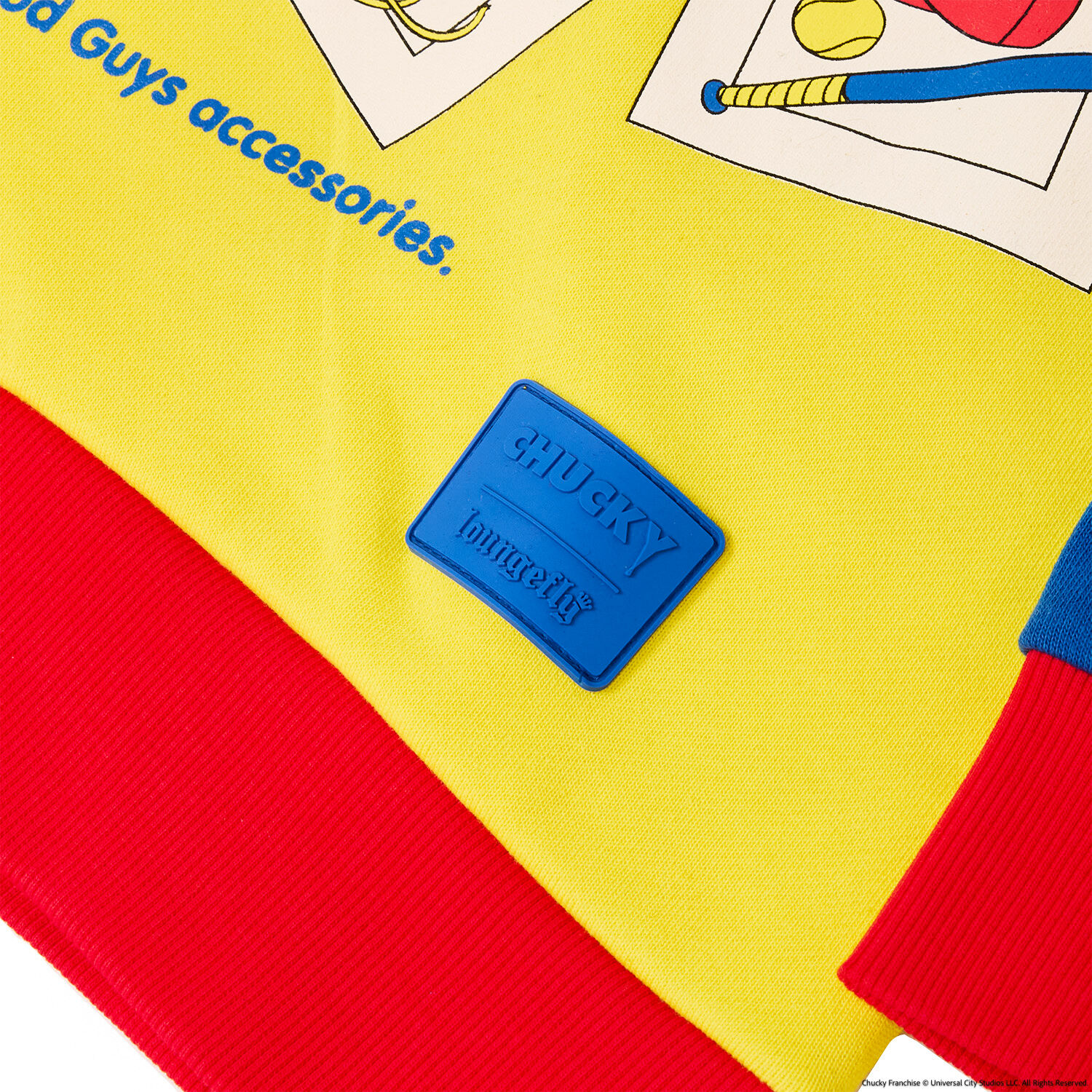 The Good Guy is ready to play up your look. Our Chucky Hooded Jersey, which resembles a Good Guys Chucky doll box, is full of frighteningly fun details. On the bright yellow middle portion, letters in red spell out “Chucky,” and the text below reads, “He wants YOU for a best friend.” It also appears that he’s ready to come out of the box, as he “slashes” a “knife” with a metallic applique blade through the clear “plastic window,” which is really a clear gel print. You’ll also see that the Chucky “box” includes pictures of the Good Guys accessories and a message to collect them all. The sleeves, similar in color to Chucky’s denim overalls, feature a motif of Good Guys accessories, such as cowboy hats, baseballs, and more. Head off to a memorable play date or other adventures in style.
