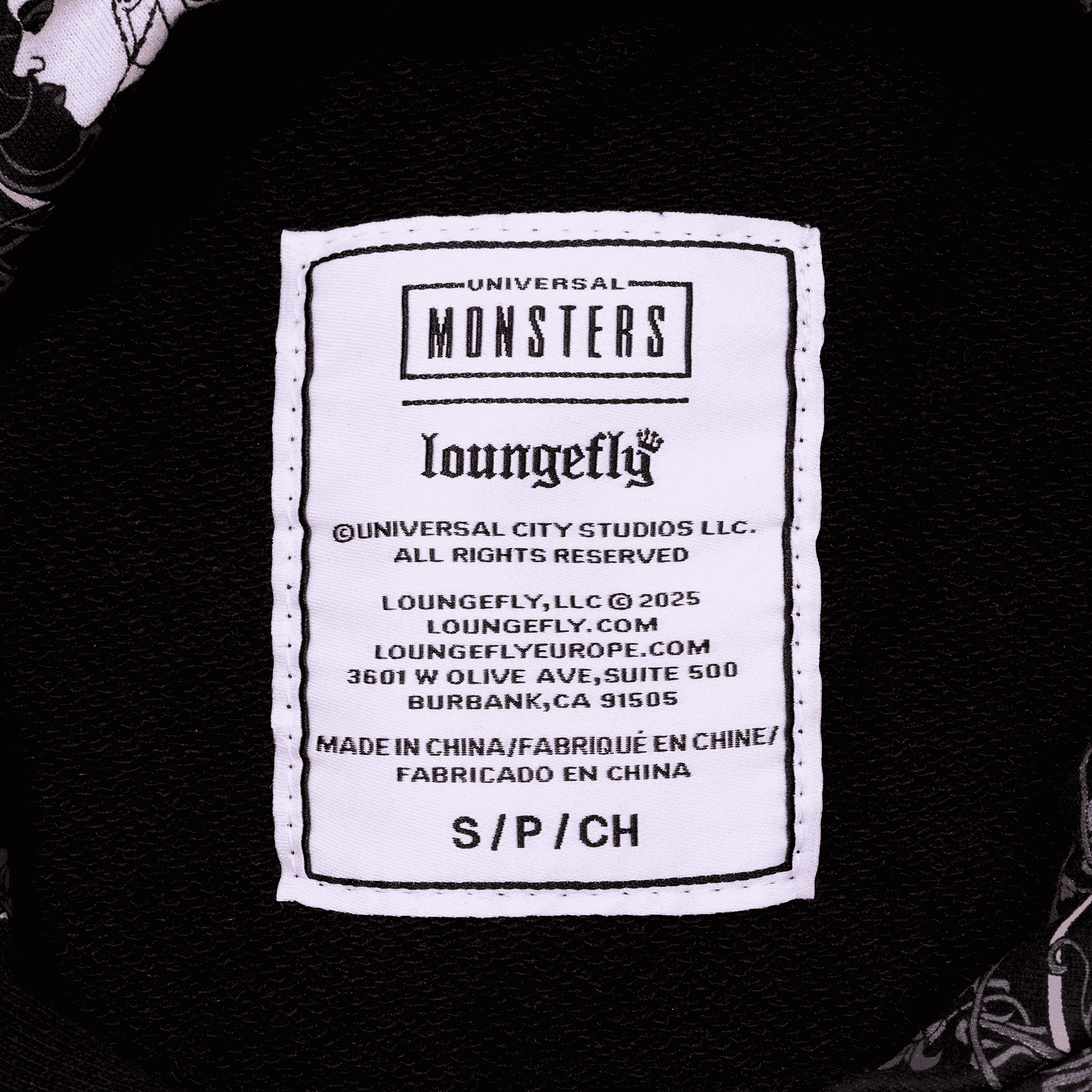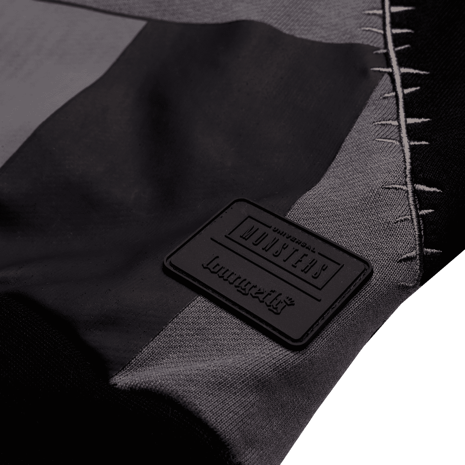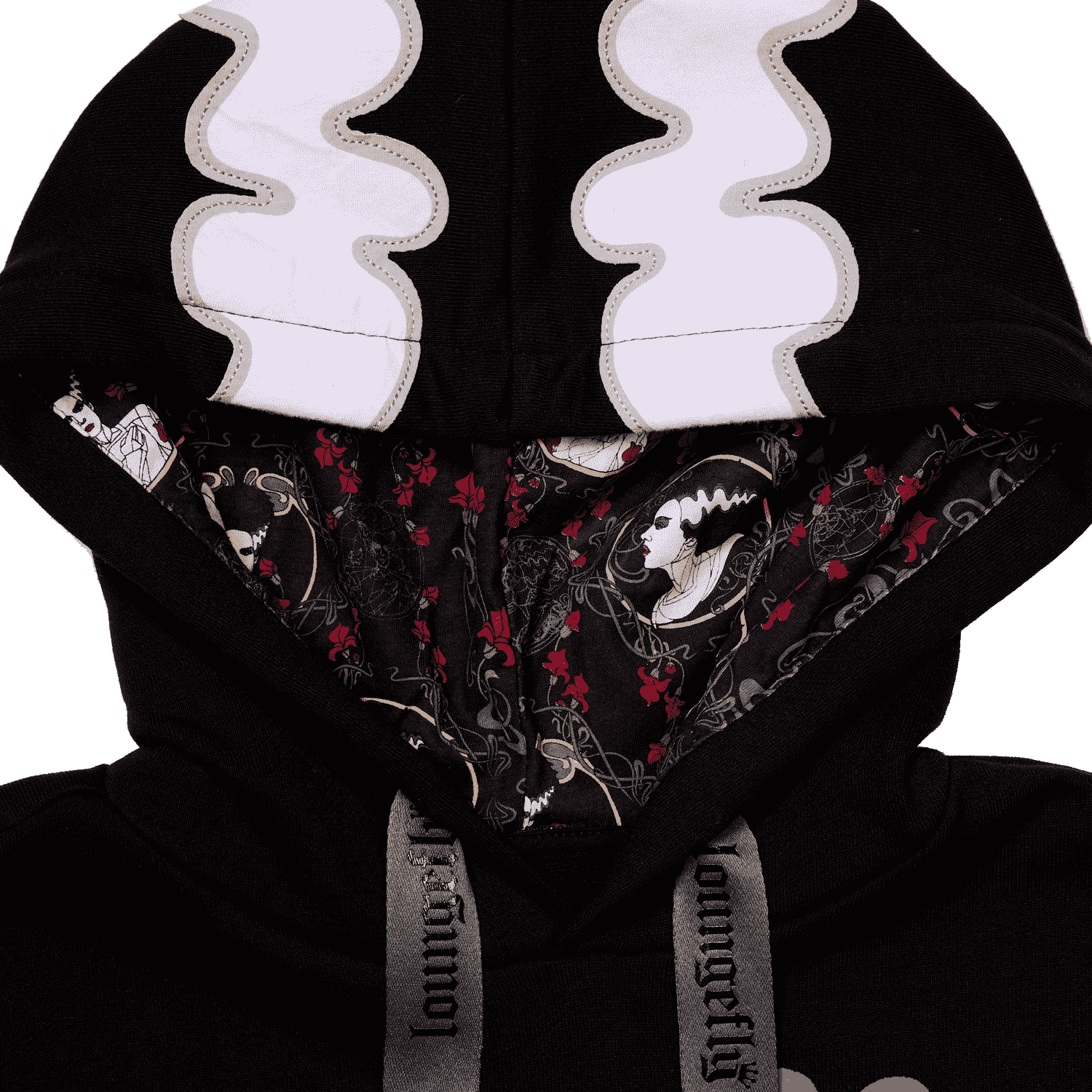 What a beautiful fright! This Bride of Frankenstein hoodie features a stunning rendition of Frankenstein’s bride and Frankenstein in stained-glass portrait style. Together, they share a moment in the spotlight as a diagonal “split screen.” A line of embroidery “stitches” the two portraits together on the diagonal. On the back, the Bride of Frankenstein’s lightning bolt stripes appear near the top as a layered element. Tour your favorite haunts or revive your spirits at the movie theater in style with this comfy hoodie.